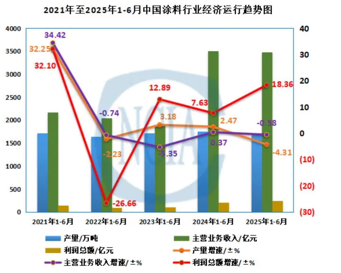 2025年上半年,涂料行业总体运行平稳,随着各类涂装下游需求上升,产能释放逐步加速,全国总产量达到1677.4万吨,较去年同期同比降低4.31%,主营业务收入总额3485.8亿元,较去年同期同比降低0.58%,利润总额245亿元,较去年同期同比增长18.36%(图1)。